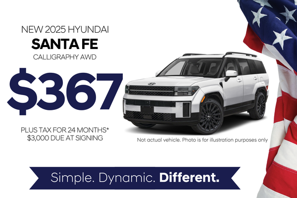 Not actual vehicle. Photo is for illustration purposes only. Stock: 20104. VIN: 5NMP5DGL0SH124926. MSRP: $52,344.00. Lease for $367.13 plus tax per month for 24 months. 7500 miles per year. $0.20 per mile over. The first payment plus $4,500.00 due at signing, incl. $1,500.00 lease rebate plus $3,000.00 cash down. $0 security deposit. Tax, title, accessories, acquisition fee, license fees, and/or other government fees excluded and due at signing. Available to qualified customers with approved credit. Financing through Hyundai Lease Titling Trust. Some customers will not qualify. See retailer for full details.